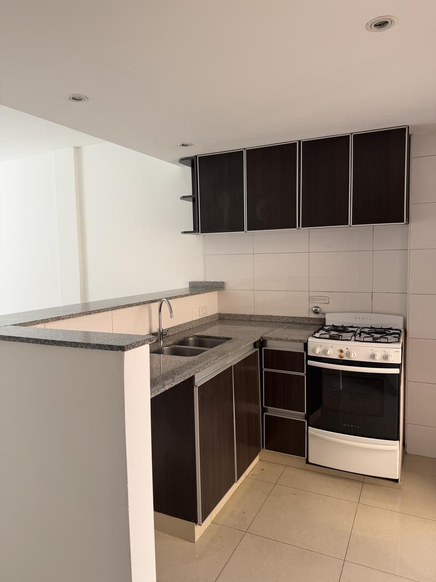 Cocina con barra desayunadora y muebles completos, alacena y bajo mesada.